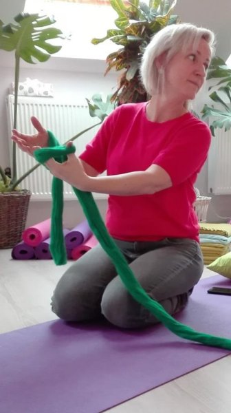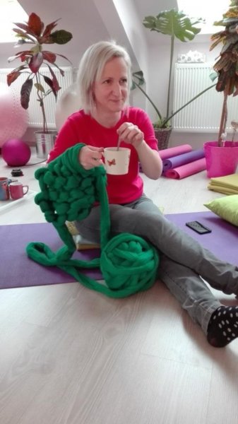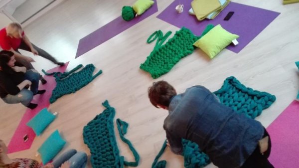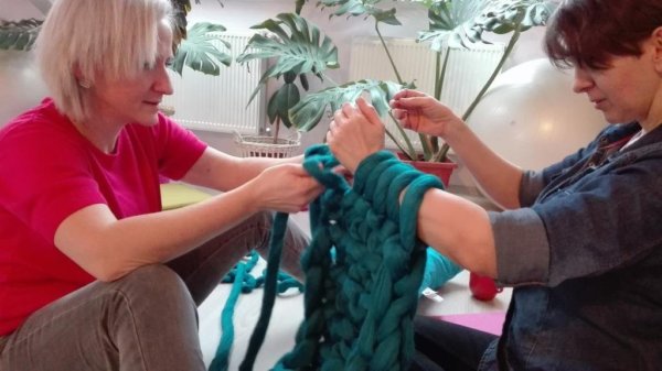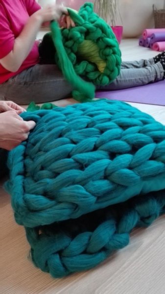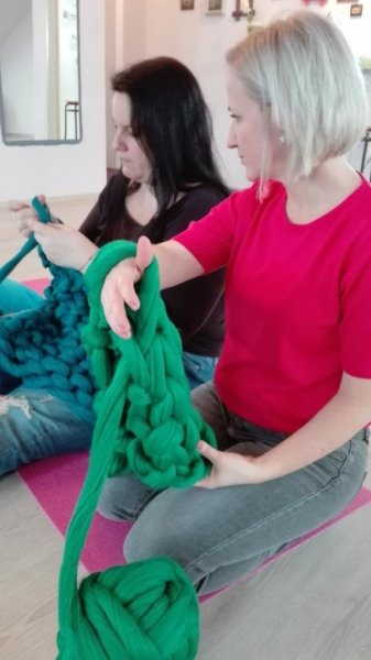A foglalkozás első pár perce az Ága által használt óriásfonal bemutatásáról szólt, majd ezt követően kezdődött a karral kötés.