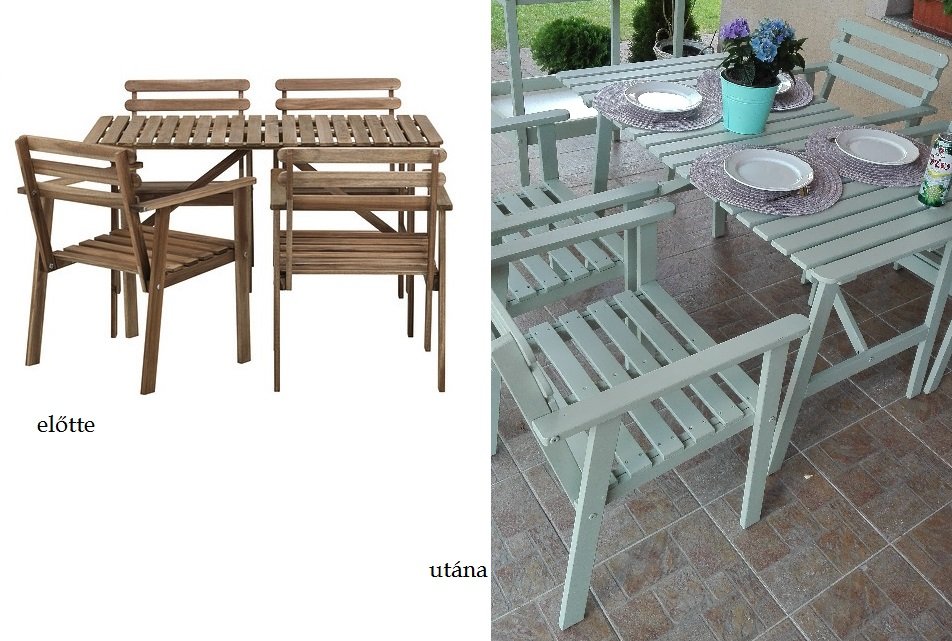 A Lazy Range a 2in1, vagyis festék és wax egyben. Ezt a felületet nem kell utókezelned – kivéve, ha vizes helyiségbe szeretnéd tenni a bútort -, mert a festék már tartalmazza a viaszt is, így száradás után csak dörzsöld át a felületet egy tiszta ronggyal és kész is vagy. A vizes helyiségbe kerülő bútort itt is érdemes az utókezelő folyadékkal átkenni. Ha dekorálni, öregíteni szeretnéd a lefestett bútort, ugyanúgy járj el, mint az Original esetén. Használhatod pl a Rustic waxot, de alkalmazhatod a dry wash technikát is egy másik szín felfestésekor. A Frenchic termékcsalád legújabb tagja az Al Fresco, amit kifejezetten kültéri bútorok és egyebek (pl. bejárati ajtó, ablak, kerítés) átfestésére fejlesztettek ki. Mi is teszteltük, a Wise Old Sage színt. Az eredmény egy nagyon kellemes pasztel árnyalat, a menta egy kellemes, visszafogott, könnyed árnyalata jutott róla eszembe. Itt egy előtte-utána kép, az egész átalakulásról egy következő bejegyzésben fogok beszámolni.